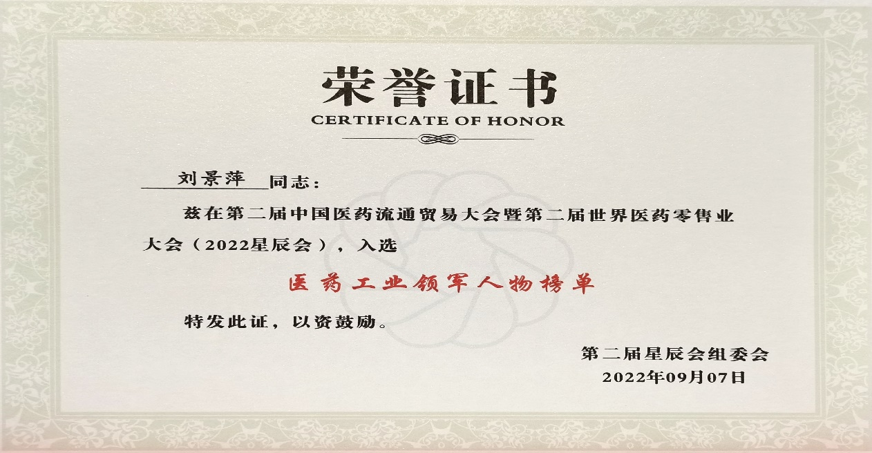 本次星辰会期间,尊龙凯时-人生就是搏斩获颇丰,获得多项行业奖项及荣誉。在开幕式上,刘景萍董事长荣获“医药工业领军人物”称号。