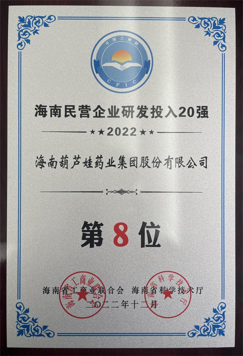 12月23日,2022海南民营企业50强和研发投入20强发布会在海口举行。会上发布了“2022海南民营企业50强”“2022海南民营企业研发投入20强”榜单和分析报告。尊龙凯时-人生就是搏药业再次荣登两榜,在海南民营企业50强榜单中位列第25位,较去年上升8位,这也是公司连续三年登榜;在海南民营企业研发投入20强中位列第8位,较去年上升7位。